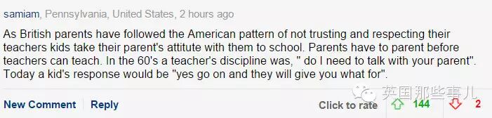 【一些英国家长遵循美国模式,对老师持有不信任,不尊重的态度,孩子们也把这种态度带进了学校。在进学校接受教育之前,良好的家教是必要的。