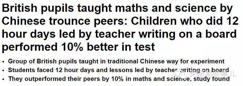 【来做个简单的统计,中国孩子每天要花12小时学习,这是英国孩子每天学习时间的两倍。这两倍时间换来的仅仅是把成绩提高10%,在我看来是场失败。】
