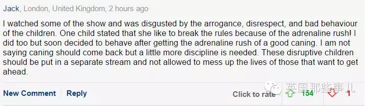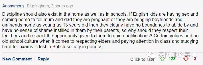 【规矩这种东西,无论是在家庭还是在学校,都是非常必要的。如果英国父母一直纵容宠溺孩子,那么就有可能出现孩子在13岁这样的年纪就偷食禁果然后怀孕,又或者把男女朋友带到家里过夜这样的情况。因为父母没有给他们设定底线,所以他们也就不知道这样付出的代价将是什么,他们也不知道为什么要在学校要尊敬师长,为什么要珍惜学习的机会。英国社会现在缺少一些优秀的价值观,还有像尊敬老师,上课认真听讲,努力通过考试这样的校园文化。】