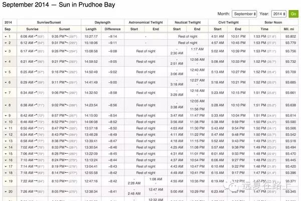 Lyra:九月初北冰洋岸边的Prudhoe Bay仍几乎整晚处在nautical twilight中,不过Wiseman和Fairbanks已经出现astronomical twilight甚至黑夜,拍极光足够了。